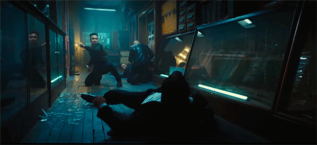 Et comment ne pas adhéré dans ce sens lorsque les tueurs sont tout aussi omniprésents que les agents de la matrice? Mais les individus à ses trousses sont loin d’être aussi identifiables, contrairement à John qui porte le costume, par balle, typique des agents. Sa tête est donc mise à prix pour 14 millions de dollars, mais il va surtout en faire usage pour se confectionner un revolver à partir de pièces détachées. Cette contre-attaque prend place dans une armurerie de Chinatwon où sont également exposés bien des couteaux. S’en suivra évidemment une séquence qui mettra à l’épreuve leur tranchant.