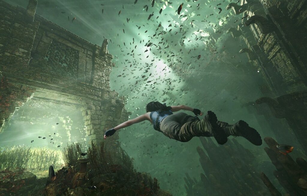 Pour ce qui est de la large place laissée aux phases sous-marines, elles auraient pu diversifier cette redondance, si elles avaient été plus limpides. Lara est loin d’être une sirène et reste beaucoup plus agile sur terre. Entre autres nouvelles aptitudes, on peut désormais descendre en rappel, se camoufler en s’aspergeant de boue ou encore se cacher dans les hautes herbes tel un raptor prêt à saisir sa proie. Dans cette configuration, l’élimination silencieuse au couteau est de rigueur en prenant notre ennemi par-derrière puis en le tirant dans les fourrés pour cacher le corps.